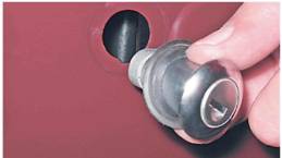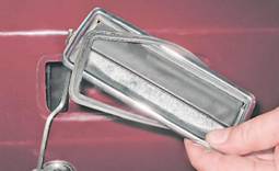 6. Снимаем ручку, выводя ее вместе с тягой из отверстия в наружной панели двери. Между ручкой и панелью двери установлена уплотнительная прокладка.