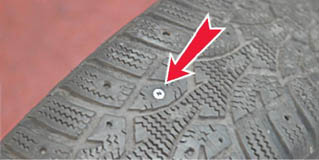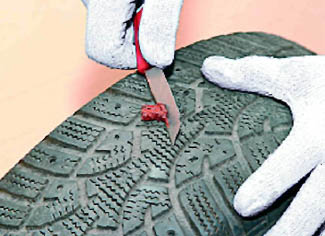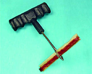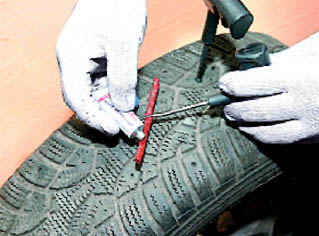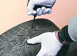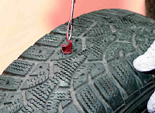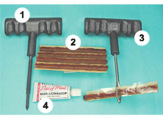 1 - приспособление с резьбовым наконечником или с насечками; 2 - полоски сырой резины; 3 - игла с разъемным ушком; 4 - клей-активатор для сырой резины Предупреждение! Шину с проколом большого размера, повреждением корда или с порезом боковины необходимо заменить. Ремонт шины возможен без снятия колеса, достаточно поддомкратить автомобиль и установить на опору. Эксплуатация автомобиля допускается сразу после ремонта. Предупреждение! При движении на отремонтированной шине следует соблюдать осторожность: снизить скорость движения, чтобы при внезапном разрушении шины иметь возможность принять адекватные меры; стараться объезжать неровности дороги, или проезжать их на низкой скорости. При первой возможности отремонтированную шину необходимо заменить. Допустимо использовать такую шину на запасном колесе. Последовательность выполнения 1. Находим место прокола (по выходящему из прокола воздуху или по предмету, пробившему шину).