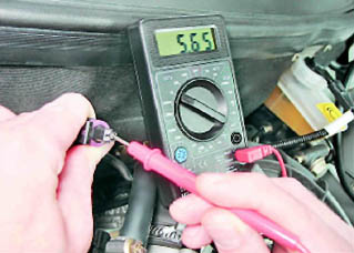 3. Подсоединяем "минусовой" щуп вольтметра к "массе" двигателя. 4. Включив зажигание, подсоединяем "плюсовой" щуп вольтметра к выводу А колодки жгута проводов (нумерация выводов нанесена на колодке), и измеряем напряжение питания.