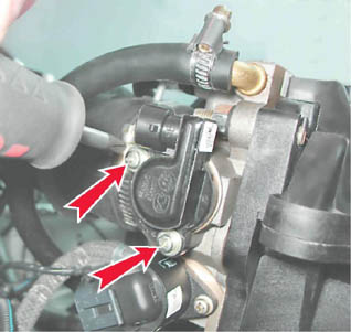 Замечание: Напряжение питания на выводе А колодки должно быть около 5 В. Если напряжение не поступает на колодку или оно меньше 5 В, то - неисправна цепь питания или неисправен ЭБУ. Предупреждение! По окончании измерения напряжения выключайте зажигание. Снятие 1. Крестовой отверткой отворачиваем два винта крепления регулятора холостого хода к корпусу дроссельной заслонки.