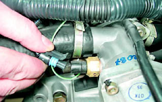 4. Подсоединяем "минусовой" щуп вольтметра к "массе" двигателя. 5. Включив зажигание, вольтметром измеряем напряжение на выводе А колодки жгута проводов (обозначение выводов нанесено на колодке жгута проводов). Замечание: Напряжение на выводе должно быть не меньше 12 В. Если напряжение не поступает на колодку или оно меньше 12 В, то - разряжена аккумуляторная батарея, неисправна цепь питания или неисправен ЭБУ. Предупреждение! По окончании измерения напряжения выключайте зажигание. 6. Ключом на 19 мм отворачиваем датчик температуры и вынимаем его из корпуса термостата. Соединение датчика с термостатом уплотнено медной шайбой.