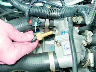 Неисправный датчик заменяем. Установка 1. Устанавливаем датчик в последовательности обратной снятию. 2. Заполняем систему охлаждения двигателя жидкостью. 3. Запускаем двигатель и убеждаемся в отсутствии утечек охлаждающей жидкости из-под датчика. При необходимости сильнее заворачиваем датчик в корпус термостата. Рекомендация: Если таким способом устранить течь не удалость, следует переустановить датчик, нанеся на его резьбовую часть термостойкий герметик или заменить медную шайбу. |