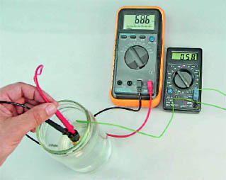7. Подсоединяем омметр к выводам датчика. 8. Заполняем емкость кипятком, погружаем в воду рабочую часть датчика и записываем показания прибора при температуре около 100 °С. По мере остывания воды измеряем сопротивление датчика при температуре 90, 80, 70, 60, 50, 45, 40, 35, 30, 25 и 20 °С.
