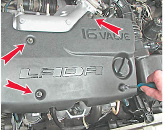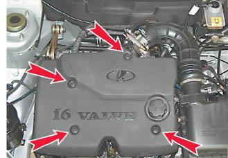 2. Торцовым ключом на 10 мм отворачиваем четыре гайки крепления пластмассовой накладки к крышке головки блока цилиндров.