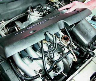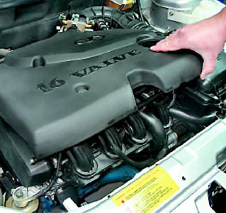 2. Приподняв, снимаем пластмассовую накладку двигателя вместе с резиновыми муфтами.