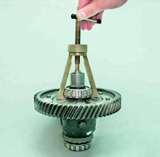 Дифференциал - разборка и сборкаПредупреждение! При замене подшипников дифференциала или его корпуса, необходимо заново подобрать толщину регулировочного кольца (см. ниже). 1. Спрессовываем подшипник с корпуса дифференциала.