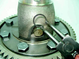 7. Разжимными щипцами разводим и снимаем стопорное кольцо оси саттелитов.