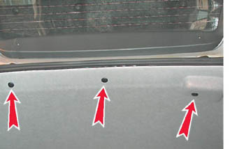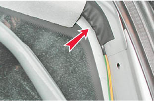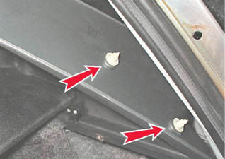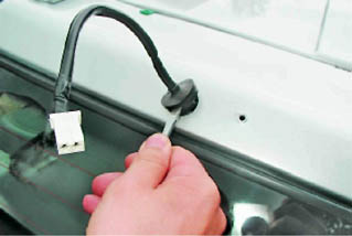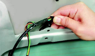 4. Помечаем цвета проводов и извлекаем наконечники проводов из колодки, аналогично тому, как это показано при снятии двери багажного отделения хэтчбека (см. 14.6.8, п. 13-15). 5. Отвернув саморез, отсоединяем декоративную накладку от задней стойки (накладку удерживают два держателя).