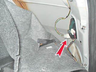 3. Отвернув четыре самореза, отгибаем правую обивку багажника и разъединяем колодки правой ветви проводов двери багажного отделения.