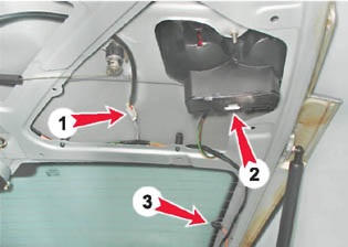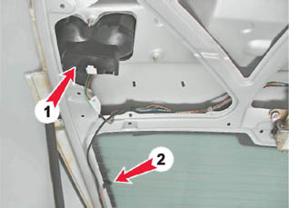 7. Аналогично освобождаем провода, проложенные по задней левой стойке. 8. Снимаем спойлер с двери (см. 14.7.2). 9. Снимаем обивку двери (см. 14.7.3). 10. Отсоединяем колодку проводов (1) от секции заднего левого фонаря и наконечник провода (2) от обогревательного элемента заднего стекла.