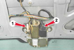 от обогревателя и разъединяем колодку проводов мотор-редуктора (1). 12. Отсоединяем колодку проводов (2) от стеклоочистителя заднего стекла и разъединяем колодку проводов (1) фонарей освещения номерного знака.