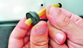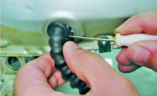 15. Отверткой извлекаем уплотнитель трубки омывателя из отверстия двери.
