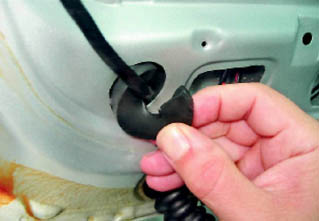 14. Отверткой утапливаем уплотнение в отверстие двери, и через отверстие вытягиваем жгут проводов вместе с колодкой внутрь двери.