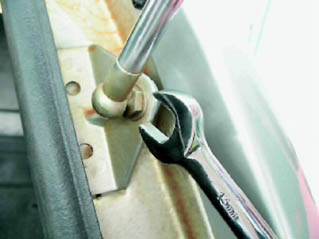 2. Рожковым ключом на 13 мм отворачиваем шаровой палец нижнего, а затем верхнего крепления газовой пружины.
