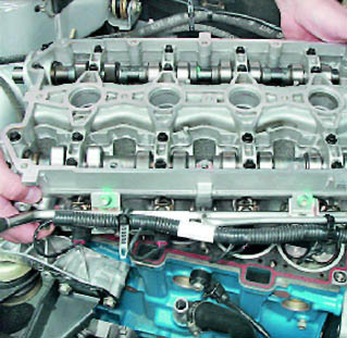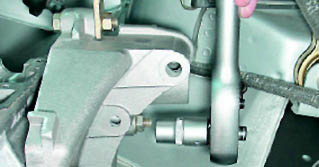 Головка блока цилиндров - снятие и установкаЗамечание: Головку блока цилиндров двигателя можно снять в сборе или после частичной разборки - снять распределительные валы. Оба варианта показаны на двигателе 21124 (1,6i). На двигателе 2112 (1,6 i)работа выполняется аналогично (особенности см. в тексте).Снятие 1. Сливаем из двигателя охлаждающую жидкость (см. 8.2.2, п. 1-7). 2. Снимаем заднюю крышку ремня привода ГРМ (см. 8.1.14). 3. Снимаем крышку головки блока цилиндров (см. 8.1.18). Замечание: Если головка блока цилиндров снимается для ее последующего ремонта, лучше ее частично разобрать до снятия: а) снимаем распределительные валы (см. 8.1.19); б) извлекаем из посадочных мест гидротолкатели (см. 8.1.20); в) снимаем топливную рампу (см. 8.3.12); г) снимаем датчик положения распределительного вала (см. 8.4.12); д) отсоединяем от кронштейна двигателя верхнюю штангу крепления силового агрегата (см. 8.132.4, с.61) Если разборка головки блока цилиндров не требуется (например, для замены прокладки головки блока цилиндров), снимать ее следует в сборе с распределительными валами, корпусом подшипников, топливной рампой, датчиками давления масла и положения распределительного вала. 4. Отсоединяем верхнюю штангу крепления силового агрегата от кронштейна головки блока цилиндров (см. 8.1.32.4). 5. Торцовым ключом на 13 мм отворачиваем три гайки крепления кронштейна штанги.
