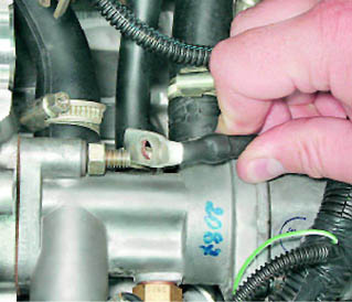 7. На двигателе 21124 (1,6i) снимаем каталитический коллектор (см. 8.5.5). На двигателе 2112 (1,5i) снимаем выпускной коллектор (см. 8.1.17) и впускной трубопровод (см. 8.1.16). 8. Ключом на 10 мм отворачиваем болт крепления наконечника провода "массы" и отсоединяем его от головки блока.