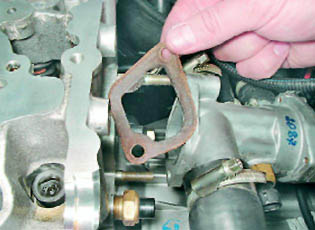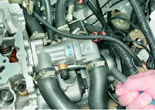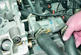 12. Снимая корпус термостата со шпилек головки блока цилиндров и, не отсоединяя шлангов, отводим его в сторону.
