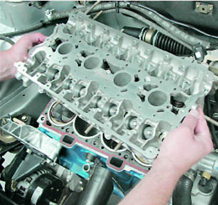 Установка 1. Промываем головку блока цилиндров от грязи и отложений керосином или дизельным топливом. 2. Удаляем из резьбовых отверстий блока цилиндров (под болты крепления головки блока) остатки масла и охлаждающей жидкости. 3. Очищаем привалочные плоскости головки и блока цилиндров от остатков старой прокладки, обезжириваем плоскости растворителем. Предупреждение! При установке головки блока цилиндров всегда используйте новую прокладку. Попадание масла на поверхность прокладки не допускается. 4. Устанавливаем направляющие втулки головки в посадочные места блока цилиндров. Укладываем на блок цилиндров прокладку, при этом направляющие втулки должны войти в соответствующие отверстия прокладки. 5. Устанавливаем на блок цилиндров головку. Слегка перемещая головку из стороны в сторону, добиваемся того, чтобы направляющие втулки вошли в соответствующие углубления головки. Предупреждение! Повторное использование болтов крепления головки блока цилиндров допускается только в том случае, если их длина не превышает 100 мм. 6. Штангенциркулем или слесарной линейкой измеряем длину болтов. Болты длиной более 100 мм заменяем.