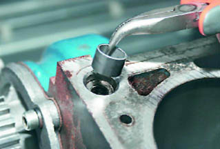 17. Чтобы не потерять, вынимаем две направляющие втулки из посадочных мест в блоке цилиндров.