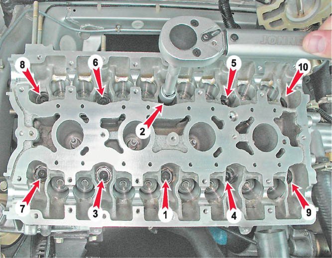 14. Шестигранным ключом на 10 мм отворачиваем десять болтов крепления головки к блоку цилиндров в указанной последовательности (см. фото ниже). 15. Снимаем головку с блока цилиндров в сборе...