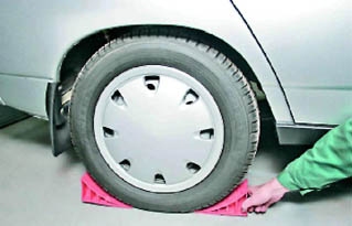 Колесо - заменаДля выполнения операции потребуются: - "баллонный" ключ или торцовый ключ на 17 мм; - домкрат; - противооткатные упоры; - подкладка под домкрат (если машина стоит на рыхлом грунте). Последовательность выполнения 1. Устанавливаем автомобиль, по возможности, на ровной горизонтальной площадке. Если в салоне автомобиля находятся пассажиры, то им следует выйти. 2. Вынимаем из багажного отделения запасное колесо и необходимый инструмент. 3. Фиксируем автомобиль стояночным тормозом и устанавливаем под колесо, расположенное по диагонали от заменяемого, с двух сторон противооткатные упоры.