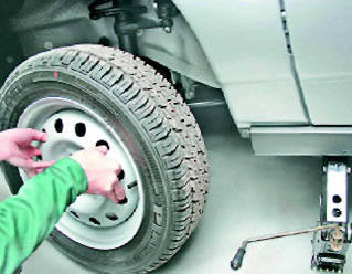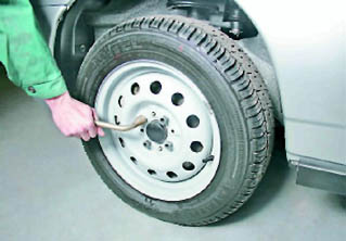 4. Снимаем декоративный колпак диска колеса (см. 10.3.2, п. 2). 5. "Баллонным" или торцовым ключом на 17 мм ослабляем затяжку всех болтов крепления колеса приблизительно на пол-оборота.