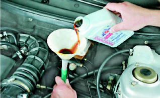 ...или через воронку, с надетой на нее трубкой, заливаем 3,3 л чистого трансмиссионного масла в коробку передач.