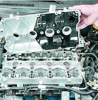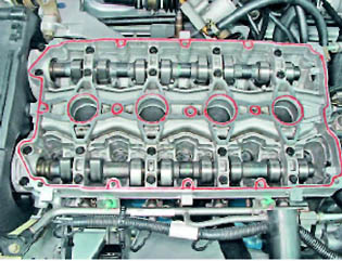 Предупреждение! При ремонте двигателя нельзя применять герметик с большим содержанием силикона (соединений кремния), пары которого могут попасть через систему вентиляции картера в цилиндры и далее в выпускной тракт Следует использовать герметик, на упаковке которого специально указано, что он безопасен для датчика концентрации кислорода. Устанавливаем крышку на место. Болты крепления крышки затягиваем в направлении от середины к краям моментом 2,0-4,6 Нм (0,2-0,5 кгс. ). |