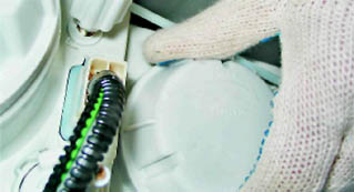 6. Отведя пружинный фиксатор вверх, извлекаем лампу дальнего света из отражателя секции, удерживая ее за вывод.