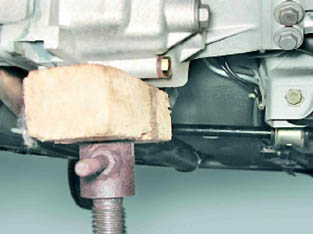 3. Устанавливаем под коробку передач регулируемый по высоте упор (домкрат) и немного приподнимаем коробку, разгружая левую опору.