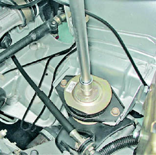 8. Торцовым ключом на 13 мм отворачиваем два болта крепления подушки опоры к кронштейну кузова.