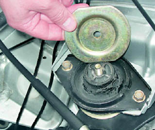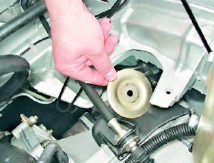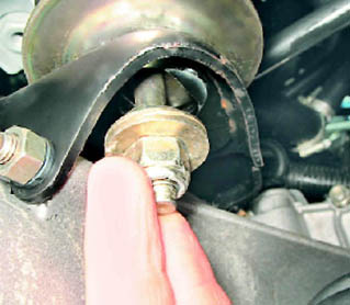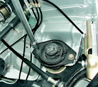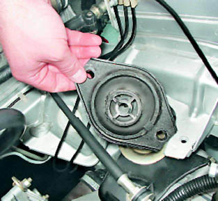 9. Немного сдвинув подушку к двигателю, снимаем ее с кронштейна.