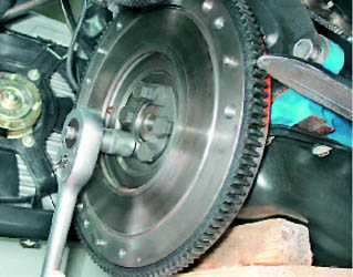 2. Торцовым ключом на 17 мм отворачиваем шесть болтов крепления маховика, удерживая его от проворачивания монтажной лопаткой или отверткой.