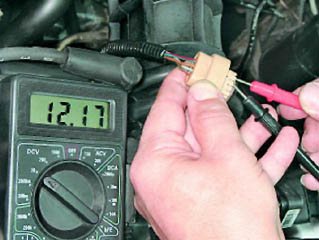 5. Включив зажигание, вольтметром измеряем напряжение между выводами С и D колодки жгута проводов.