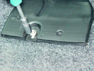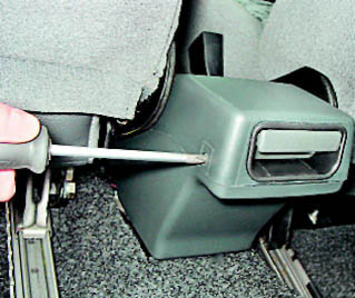 5. Сдвигаем сиденья назад до упора. 6. Специальной угловой отверткой, либо отвернув по четыре гайки крепления передних сидений (см. 14.8.5, п. 2-6) и откинув сиденья назад, отворачиваем два самореза среднего крепления верхней части накладки.