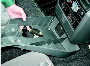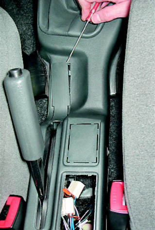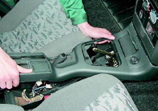 14. Разъединяем две пары колодок проводов прикуривателя (см. 14.8.3, п. 20). 15. Приподняв заднюю часть верхней накладки туннеля пола, сдвигаем ее назад, выводя переднюю часть накладки из зацепления с центральной консолью.