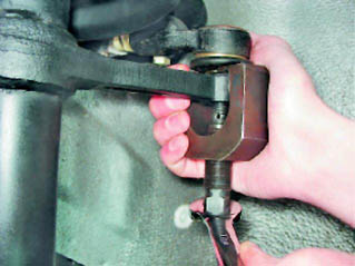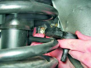 6. Съемником выпрессовываем палец из отверстия поворотного кулака стойки передней подвески.