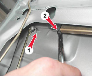 4. Накидным ключом на 10 мм отворачиваем гайку (2) крепления наружной ручки двери. Торцовым ключом с глубокой головкой на 10 мм отворачиваем гайку (1) через отверстие в панели двери.