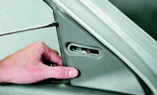 2. Тонкой шлицевой отверткой извлекаем из рукоятки управления зеркалом заглушку.