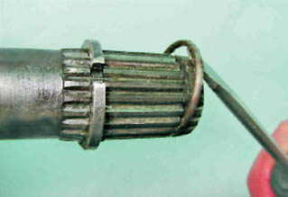8. Шлицевой отверткой поддеваем и снимаем со шлицев вала привода стопорное кольцо.