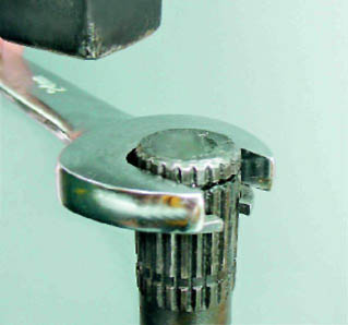 Совет: Не используйте для установки упорного кольца торцовую головку. Внутренняя фаска, имеющаяся почти на всех головках, сожмет кольцо, что не позволит установить его на вал. 3. Закрепляем вал привода в тисках в вертикальном положении. Используя рожковый ключ на 24 мм как оправку, устанавливаем на шлицевой конец вала упорное кольцо.