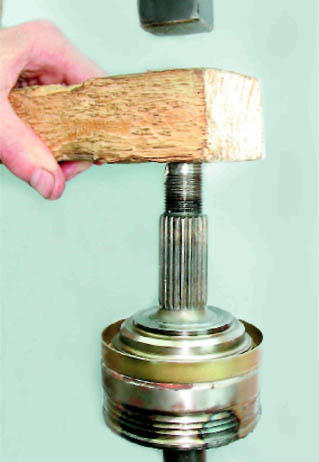 6. Срезаем защитный чехол ножом. Предупреждение! Если шарнир будет использован повторно, то нельзя наносить удары по сепаратору или корпусу шарнира. 7. Нанося удары по внутренней обойме шарнира через выколотку из мягкого металла, спрессовываем наружный шарнир с вала привода.