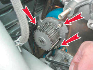 4. Шестигранным ключом на 5 мм (или торцовым ключом) отворачиваем три болта крепления насоса охлаждающей жидкости.