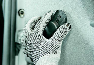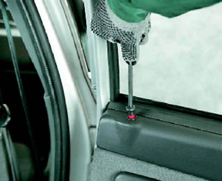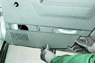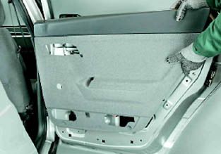8. Шлицевой отверткой с широким лезвием (подложив под нее ткань, сложенную в несколько слоев) отжимаем обивку от двери. При этом извлекаем восемь держателей крепления обивки из отверстий двери (см. 14.2.3, п.8). 9. Слегка приподнимаем обивку и снимаем ее с двери.
