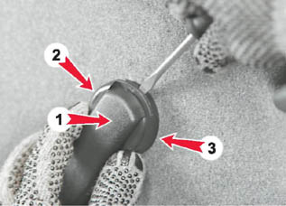 3. Со стороны задней части ручки стеклоподъемника (1) вставляем лезвие тонкой шлицевой отвертки между розеткой (3) и облицовкой ручки (2). Отжимаем облицовку ручки от розетки, освобождая фиксатор (выступ) расположенный на внутренней стороне облицовки ручки. В таком положении...