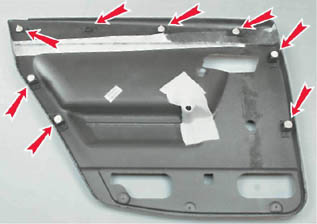 Установка Устанавливаем обивку двери в обратной последовательности. Перед установкой обивки проверяем держатели крепления - деформированные или поврежденные держатели заменяем.