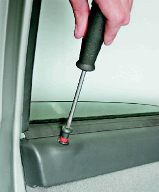 6. На двери, оборудованной стеклоподъемником с механическим приводом, снимаем ручку привода стеклоподъемника (см. 14.3.4, п. 4). 7. Крестовой отверткой отворачиваем три самореза крепления нижней пластмассовой накладки облицовки обивки.