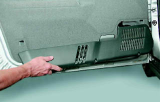 Замечание: Следует стараться извлечь держатели из отверстий двери. Чтобы не повредить обивку, располагайте лезвие отвертки как можно ближе к держателям. 10. Снимаем обивку.