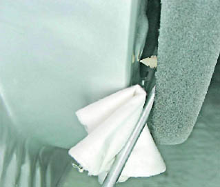 9. Шлицевой отверткой с широким лезвием (подложив под нее ткань, сложенную в несколько слоев) отжимаем обивку от двери, при этом извлекаем восемь держателей крепления обивки из отверстий двери.