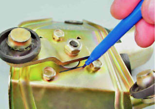 Очиститель ветрового стекла - ремонтРекомендация: Неисправный мотор-редуктор стеклоочистителя следует заменить в сборе. Разборка 1. Снимаем стеклоочиститель ветрового стекла с автомобиля (см. 13.8.1). Предупреждение! Если перед снятием стеклоочистителя его рычаги были подняты в вертикальное положение, то необходимо подсоединить колодку жгута проводов мотор-редуктора к бортовой сети автомобиля, включить стеклоочиститель в прерывистом режиме и, дождавшись, когда стеклоочиститель отработает полный цикл, отключите его. После этого можно разбирать стеклоочиститель. Совет: Перед снятием тяг запомните или пометьте их положения. Это упростит сборку. 2. Большой шлицевой отверткой разъединяем все шаровые шарниры тяг стеклоочистителя.